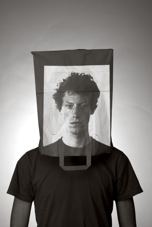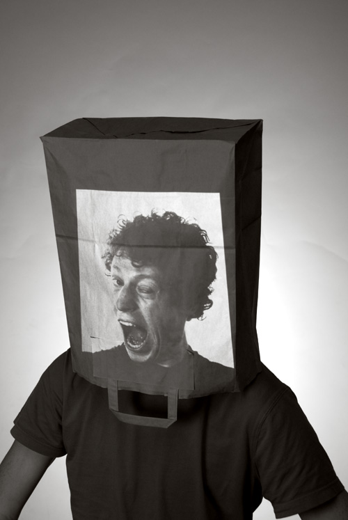 Die Papiertüte anonymisiert die Person und blockiert ihren Ausdruck. Die Projektion hebt die Blockade auf und macht ein mögliches Ich sichtbar. (Gemeinschaftsprojekt mit Hannes Ruß)
